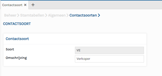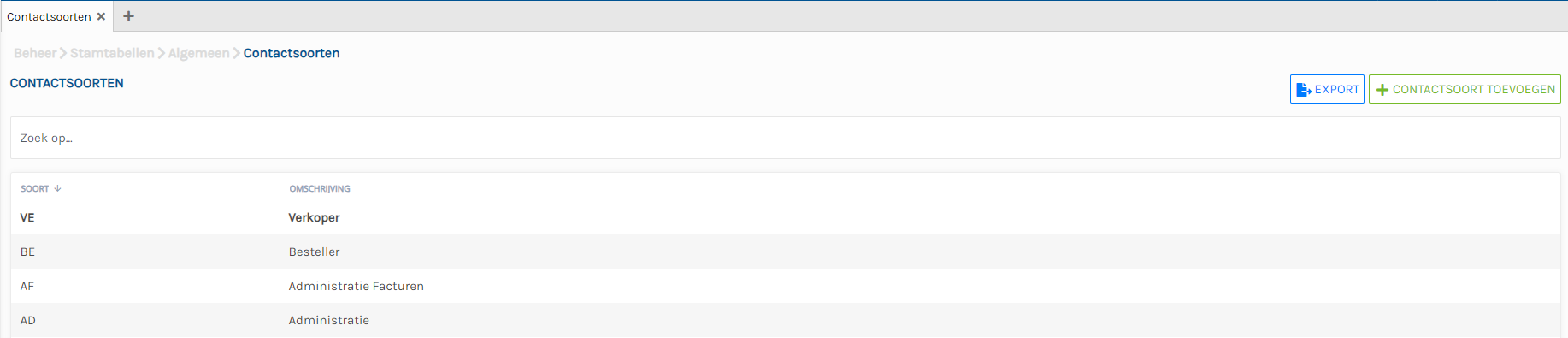 In dit scherm kunt u contactsoorten zien en kunt u nieuwe contactsoorten toevoegen door op