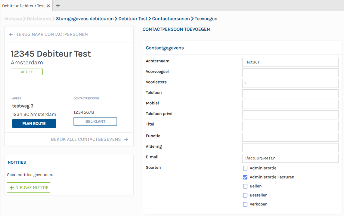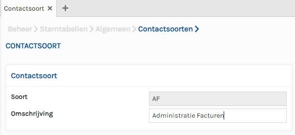 En vinkje bij de juiste contactsoort. In dit geval Administratie Facturen.