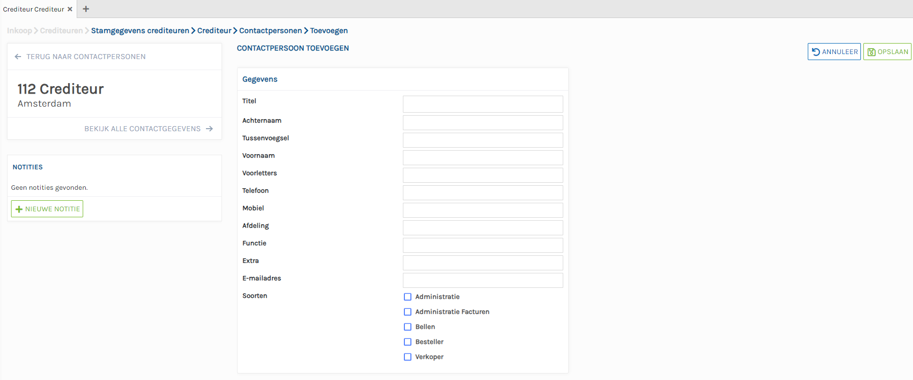 Op dit scherm kunt u contactpersonen toevoegen voor deze crediteur.