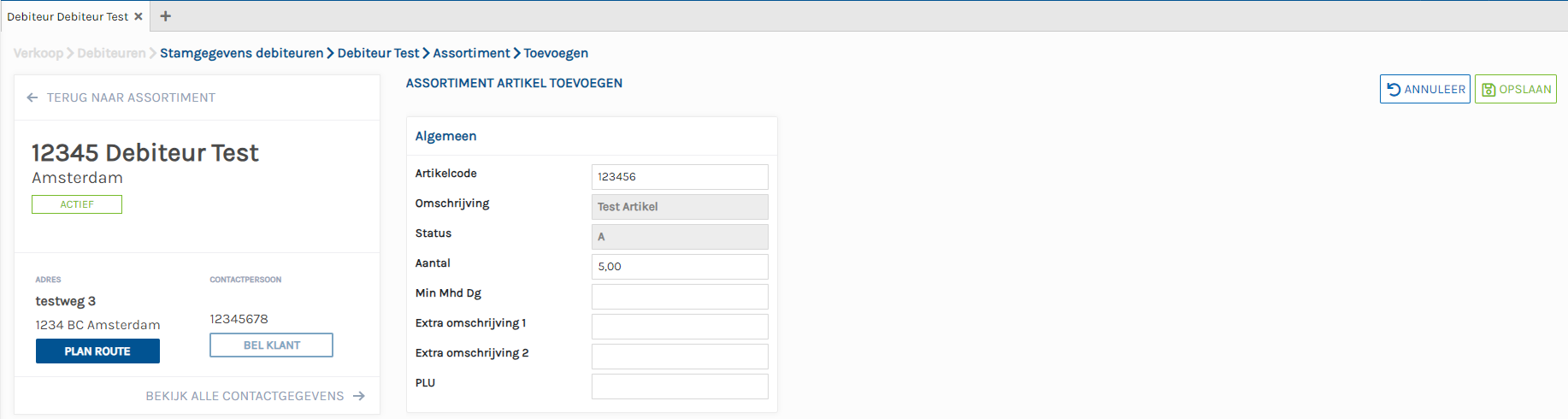 U kunt assortimenten toevoegen bij crediteuren en bij debiteuren. Wanneer u een artikel met bijvoorbeeld een aantal of omschrijving toevoegt aan het assortiment van een crediteur of debiteur komen deze regels automatisch op nieuwe in- of verkooporders te staan indien de instelling hiervoor aan staat.
