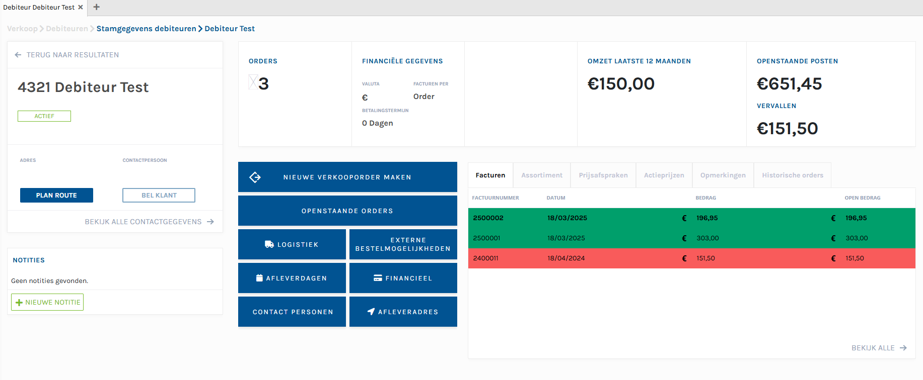 Verder kunt u rechts in de tabjes uw facturen bekijken, prijsafspraken en actieprijzen maken voor deze debiteur en kunt u een assortiment en/of een opmerking toevoegen.