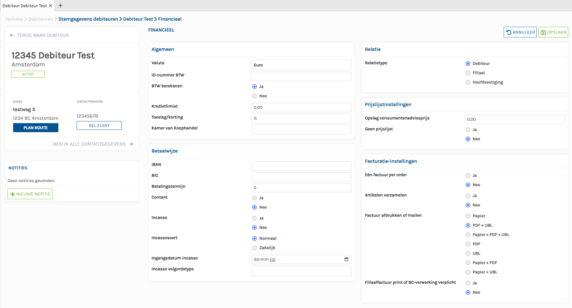 Hier kunt u verschillende financiële gegevens toevoegen of wijzigen van de debiteur waaronder: betaalgegevens, facturatie instellingen en prijslijstinstellingen.