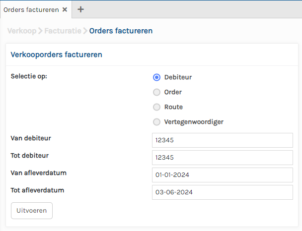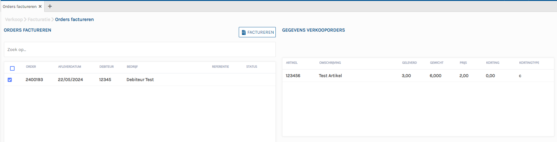Hierna klikt u op "uitvoeren" en zet u vinkjes bij de orders die gefactureerd moeten worden en kunt u op de knop “factureren” klikken.