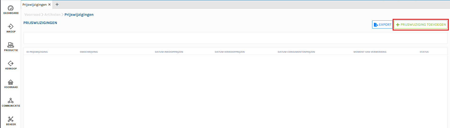 Op dit scherm kunt u een overzicht zien van prijswijzigingen, deze kunt u eventueel controleren of wijzigen. Ook kunt u nieuwe prijswijzigingen toevoegen door op: “Prijswijziging Toevoegen” te klikken.