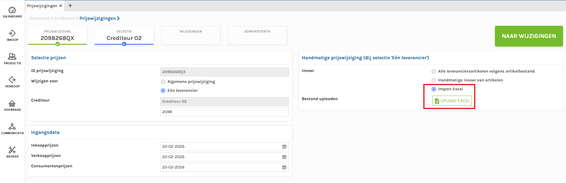 Als eerste komt u op het scherm ‘selectie’. Hier kunt u een crediteur selecteren waarbij u de prijzen wilt wijzigen. U kunt de ingangsdatum voor de verschillende soorten prijzen (inkoop, verkoop en consument) aanpassen en kunt u er voor kiezen om artikelen handmatig in te voeren.