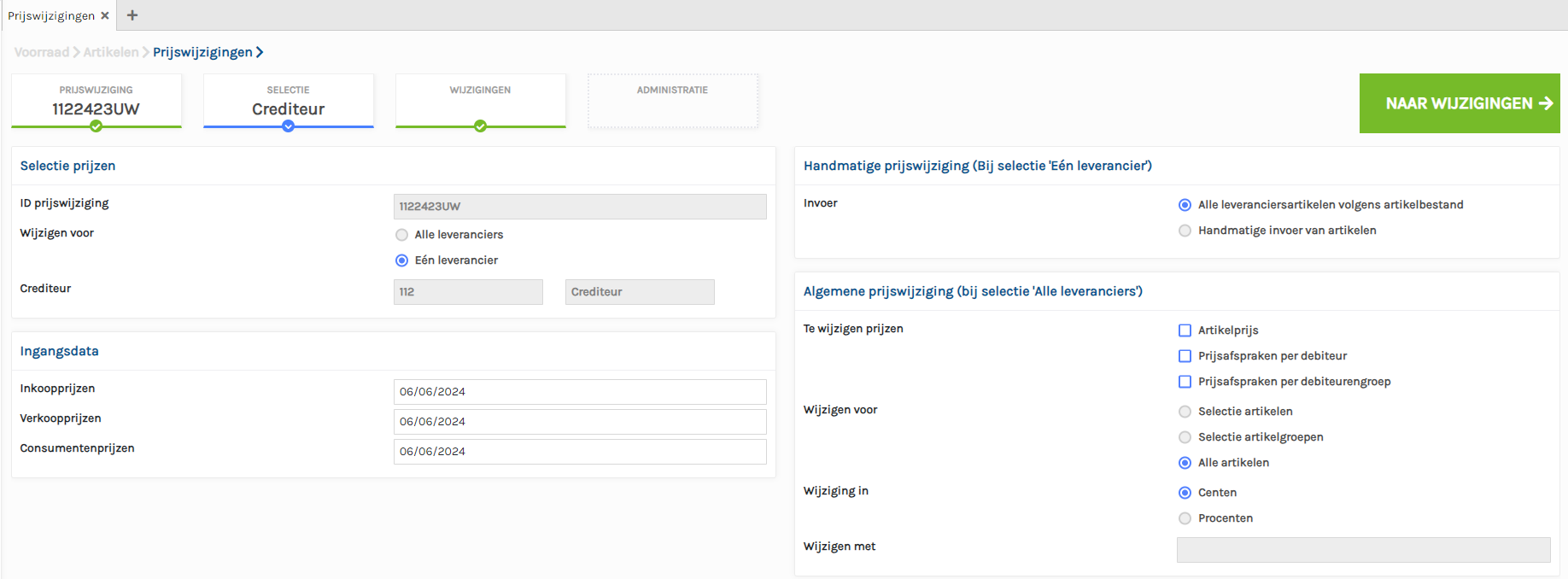 Nadat u dat gedaan heeft komt u op de pagina ‘Wijzigingen’. Op deze pagina kunt u met verschillende tabjes alle prijzen zien en aanpassen die relevant zijn aan de geselecteerde crediteur.