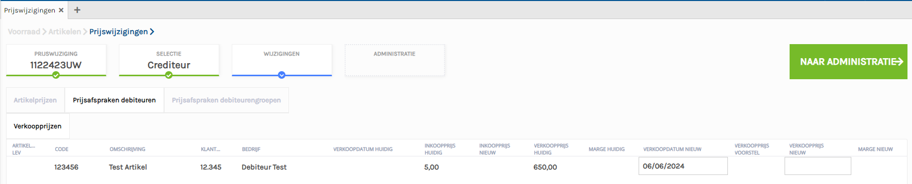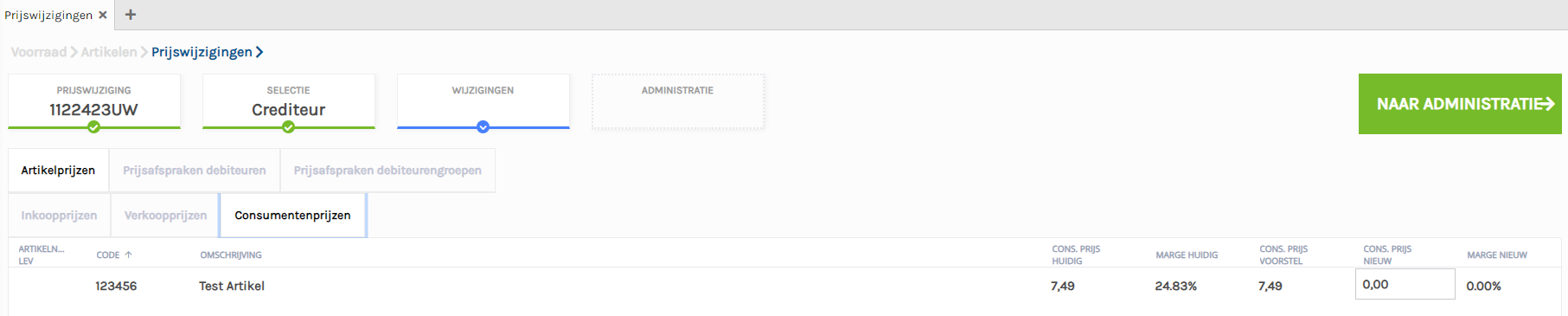 Nadat u alle prijzen heeft ingevuld/gecontroleerd kunt u naar de stap ‘Administratie’. Hier ziet u het aantal wijzigingen en kunt u de prijswijziging afronden.